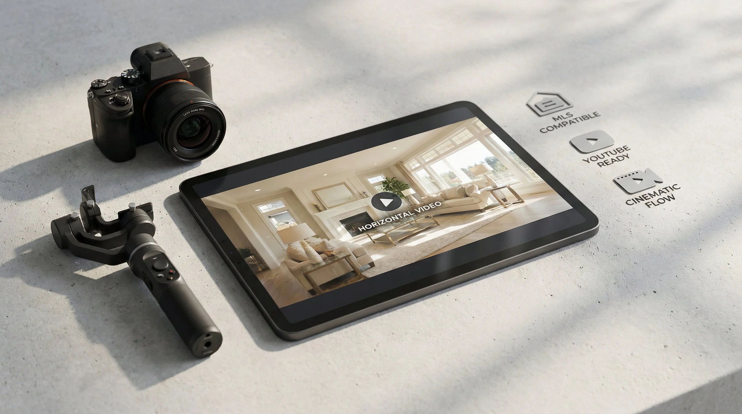 Horizontal format (16:9) for MLS, Zillow, Redfin, YouTube, and websites